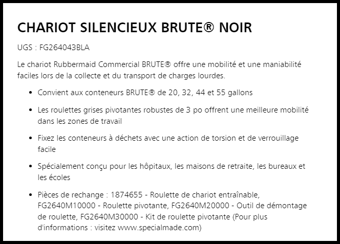 • Convient aux conteneurs BRUTE® de 20, 32, 44 et 55 gallons