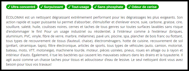 ÉCOLOMAX est un nettoyant dégraissant extrêmement performant pour les dégraissages les plus exigeants. Son action rapide et super puissante lui permet d’absorber, d’émulsifier et d’enlever encre, suie, carbone, graisse, cire, souillure, saleté, huile, coulisses noires, cernes et taches de tous genres sur toutes surfaces lavables sans risque d’endommager le fini! Pour un usage industriel ou résidentiel, à l’intérieur comme à l’extérieur (briques, aluminium, PVC, vinyle, fibre de verre, marbre, mélamine), pavé uni, piscine, spa, plancher de bois franc ou flottant, tous types de recouvrement de tissus (fauteuil, chaise), électroménagers, hotte de cuisine, recouvrement de sol (prélart, céramique, tapis), filtre électronique, articles de sports, tous types de véhicules (auto, camion, motorisé, bateau, moto, VTT, motoneige), machinerie lourde, moteur, pièces usinées, pneus, roues en alliage ou à rayon et intérieur d’auto. Également, il tue les bactéries qui causent les mauvaises odeurs dans les drains et la tuyauterie. Il agit aussi comme un chasse taches pour tissus et adoucisseur d’eau de lessive. Le seul nettoyant dont vous avez besoin pour tous vos travaux! Ultra concentré. Surpuissant. Tout-usage. Sans phosphate. Odeur de cerise. *** Caisse de 4 X 4L, vendu à l'unité ***